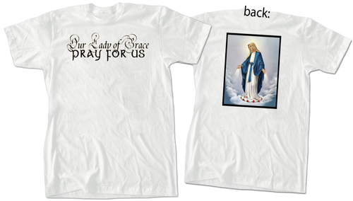 Show your love and devotion to Our Lady of Grace with this unique t-shirt! The front of this exclusive pre-shrunk, 50% cotton-50% polyester white t-shirt says "Our Lady of Grace, Pray for Us." This t-shirt, available in Small-XXX Large, is an excellent way to show and share your faith!